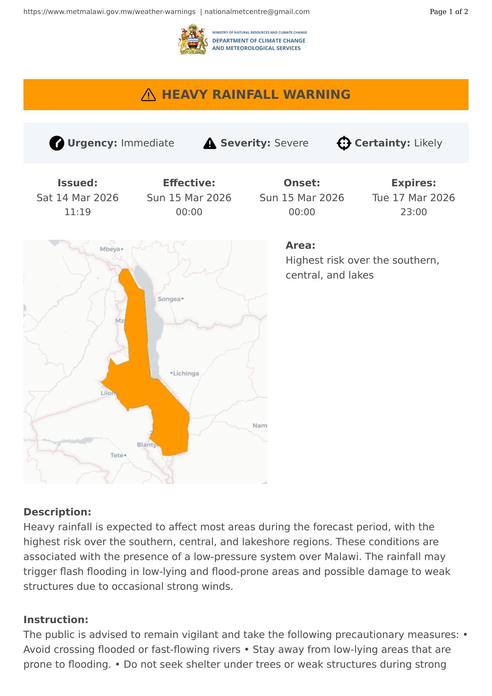 Heavy rainfall is expected to affect most areas during the forecast period, with the highest risk over the southern, central, and lakeshore regions. These conditions are associated with the presence of a low-pressure system over Malawi. The rainfall may trigger flash flooding in low-lying and flood-prone areas and possible damage to weak structures due to occasional strong winds.
