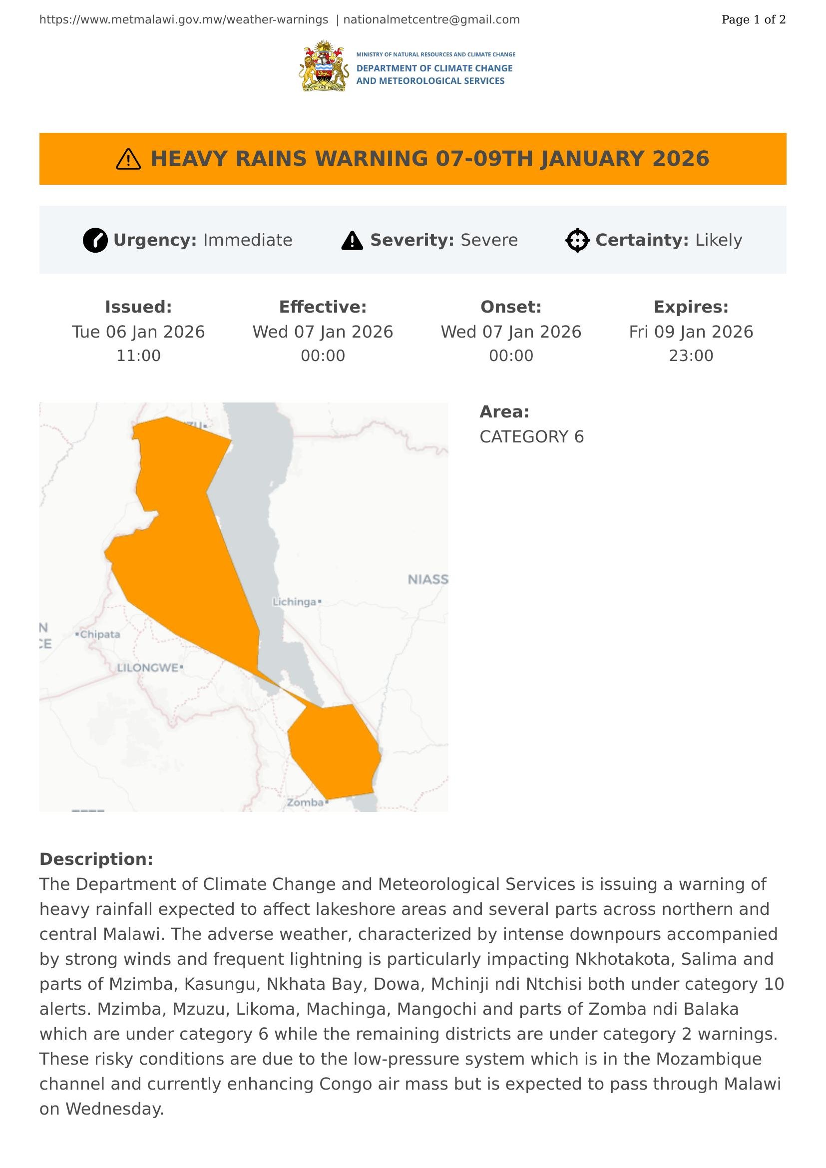 The Department of Climate Change and Meteorological Services is issuing a warning of heavy rainfall expected to affect lakeshore areas and several parts across northern and central Malawi. The adverse weather, characterized by intense downpours accompanied by strong winds and frequent lightning is particularly impacting Nkhotakota, Salima and parts of Mzimba, Kasungu, Nkhata Bay, Dowa, Mchinji ndi Ntchisi both under category 10 alerts. Mzimba, Mzuzu, Likoma, Machinga, Mangochi and parts of Zomba ndi Balaka which are under category 6 while the remaining districts are under category 2 warnings. These risky conditions are due to the low-pressure system which is in the Mozambique channel and currently enhancing Congo air mass but is expected to pass through Malawi on Wednesday.