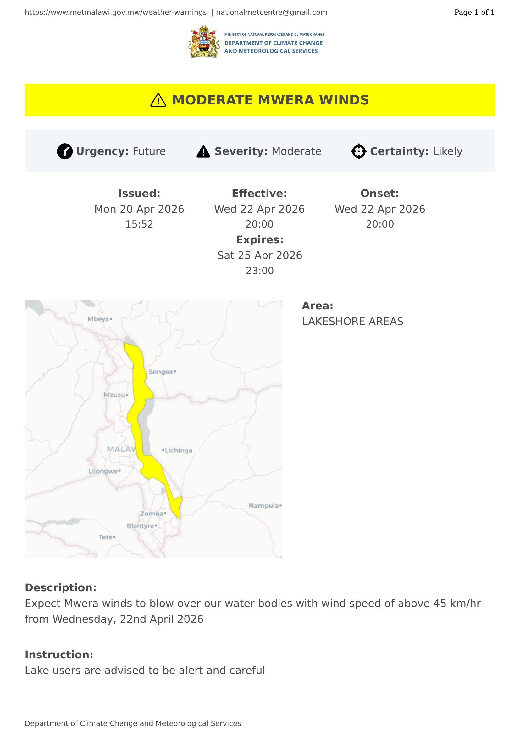 Expect Mwera winds to blow over our water bodies with wind speed of above 45 km/hr from Wednesday, 22nd April 2026